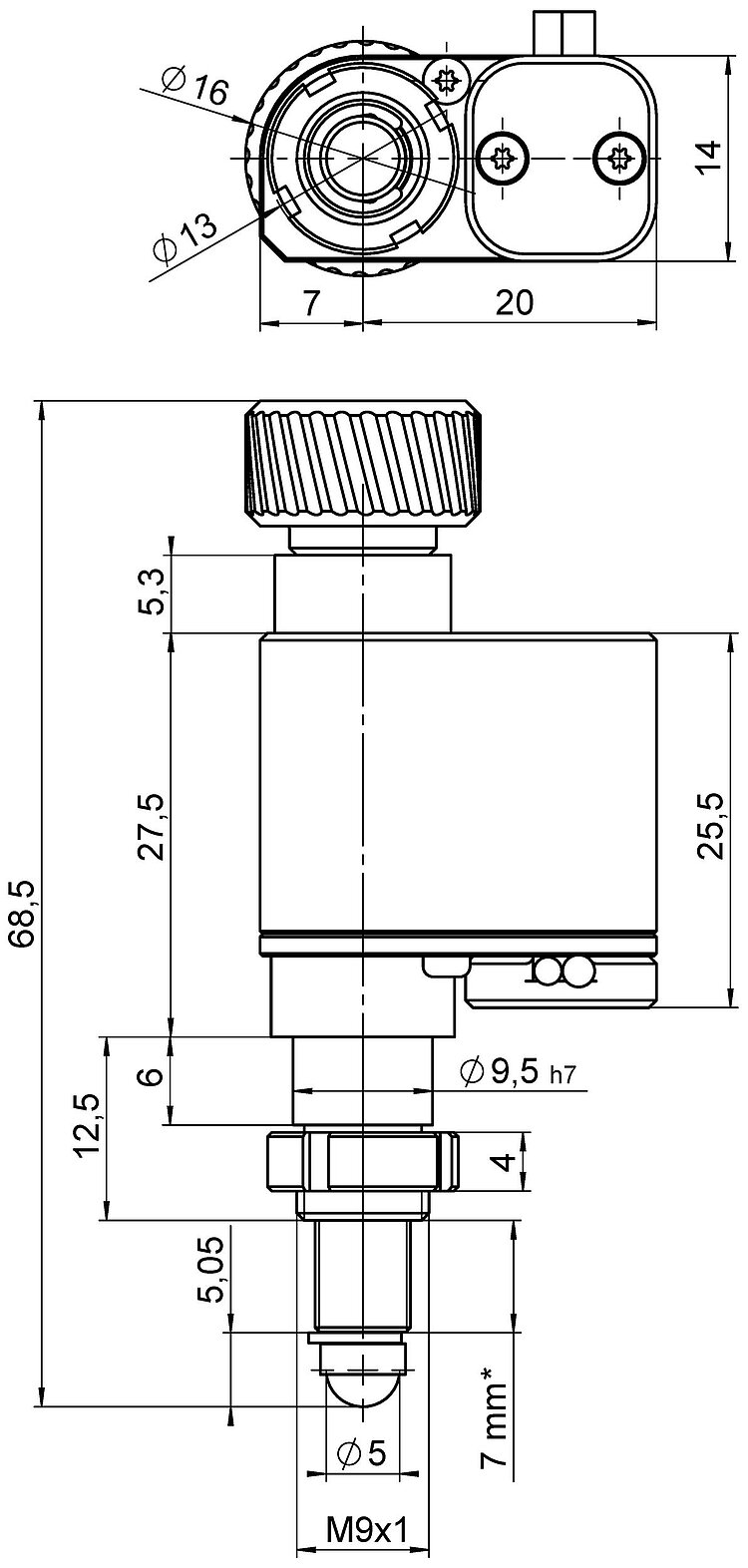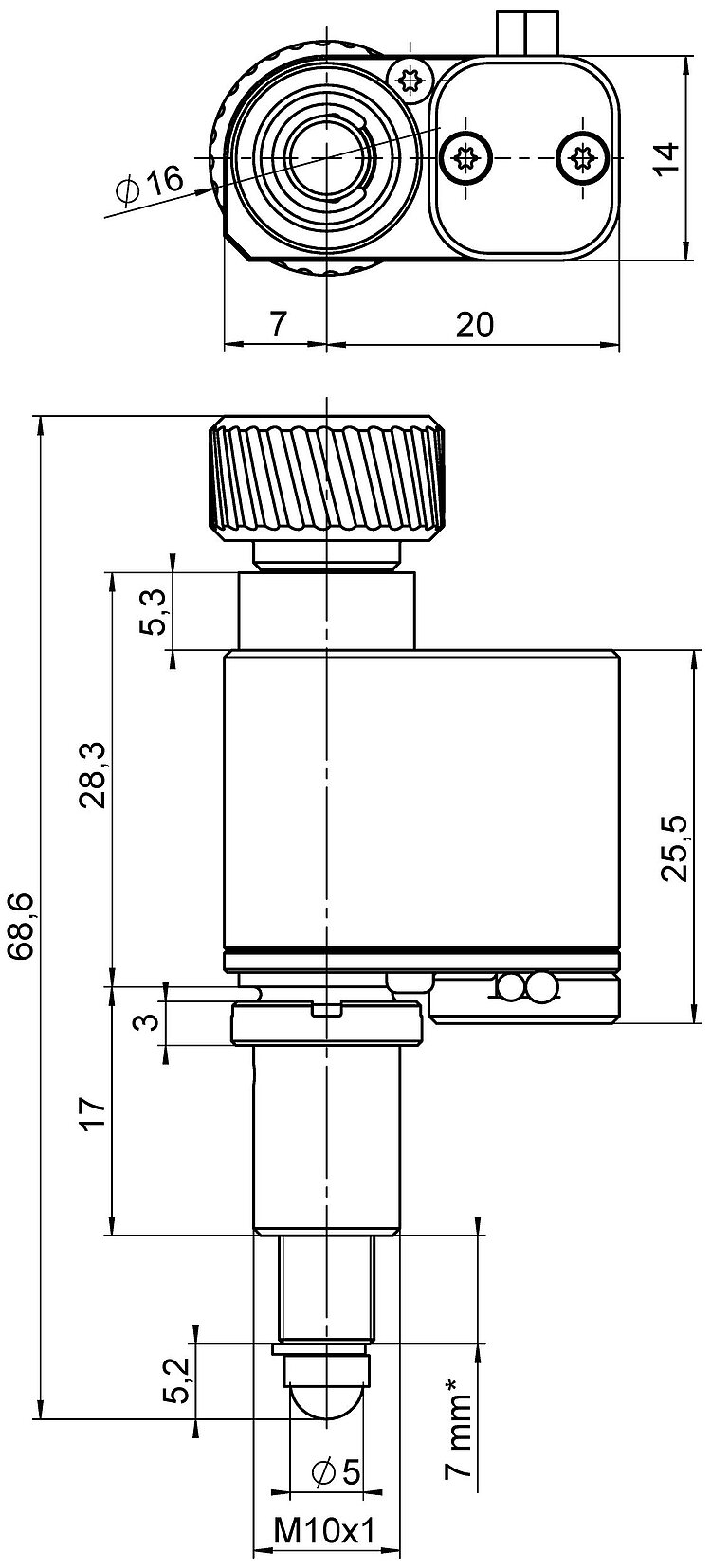Closed loop PiezoMike linear actuator; piezoelectric inertia drive; 7 mm travel range; M10×1 thread; 22 N feed force; 2 mm/min maximum velocity; 2 m cable length; turned cable exit