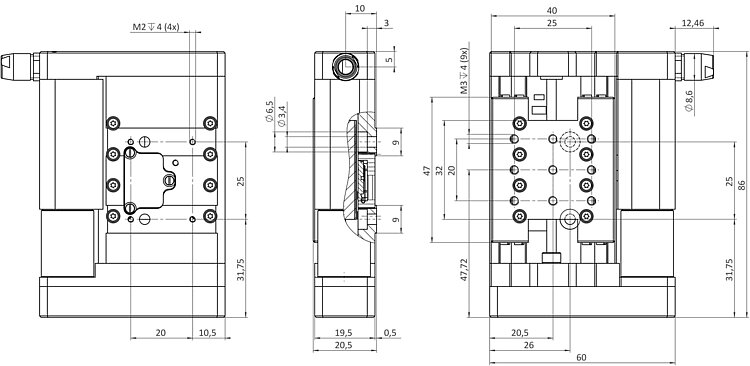 Microtranslation stage; DC motor; 25 mm travel range; 50 N load capacity; 20 mm/s maximum velocity; ball screw; incremental linear encoder, 100 nm sensor resolution, A/B quadrature, RS-422; 0.5 m cable length