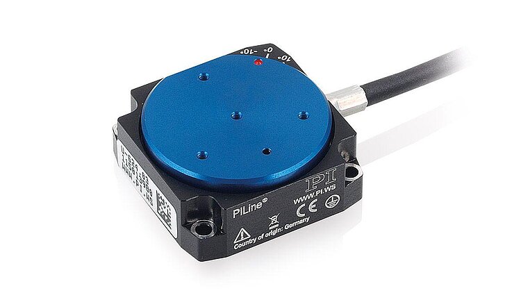 PILine® rotation stage; PILine® piezo motor, performance class 1; >360 ° rotational angle; 1 N load capacity; 720 °/s maximum angular velocity; incremental angle measuring system, 35 µrad sensor resolution; 1.5 m cable length
