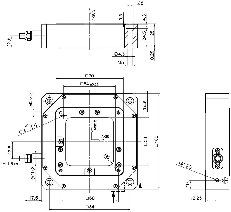 XYZ piezo nanopositioner; 100 µm × 100 µm × 10 µm travel range (X × Y × Z); capacitive, indirect position measuring; D-sub 25W3 (m); 1.5 m cable length