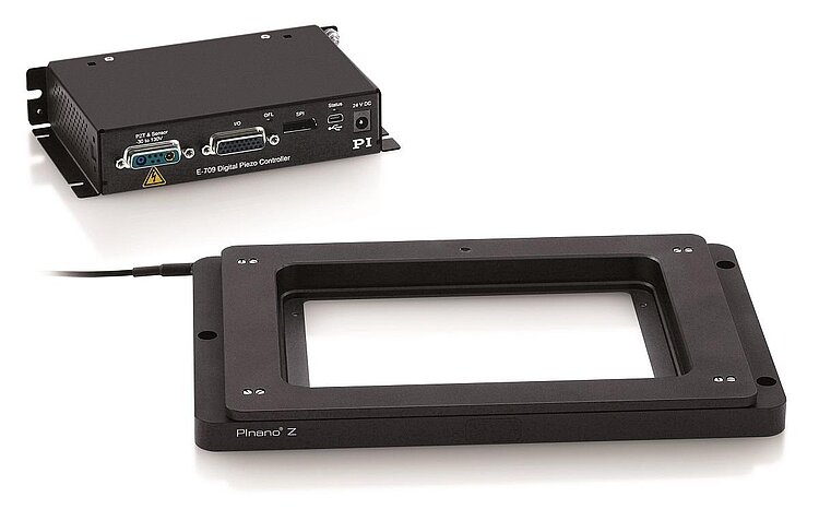 The compact E-709 digital servo piezo controller is included in the delivery. Digital servos allow adaptation of all control parameters on the fly, by software. Control is possible via USB, RS-232 and a broadband analog interface. Supports PIMikroMove, NanoCapture. PI General Command Set (GCS). Drivers for LabVIEW, shared libraries for Windows and Linux. Compatible with µManager, MATLAB and Andor iQ.
