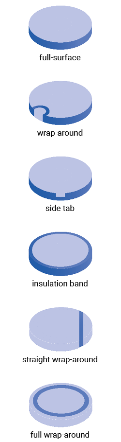 Electrode designs | Choose between various designs: full-surface, wrap-around, side tab, insulation band, straight wrap-around, full wrap-around (see right column) |