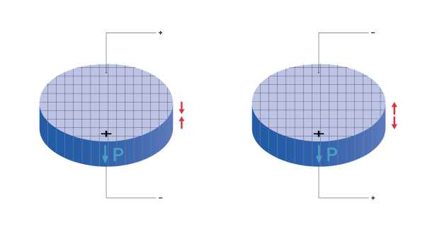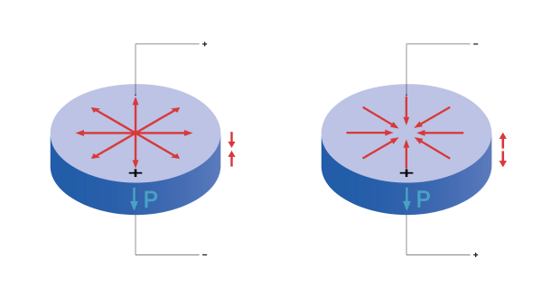 Polarization direction | Depending on the design of the piezo components, it is possible to achieve displacements in an axial and radial direction. For further information see >> Operating Modes. |