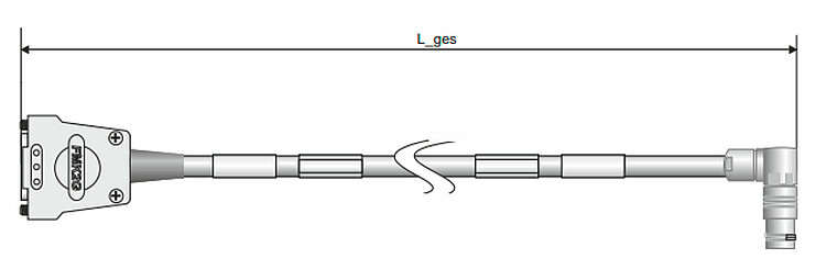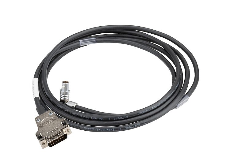 Connection cable for hexapods without integrated power drivers; D-sub HD 26 (m) to circular push-pull connector 16-pole (m) 90°; suitable for drag chains; 7.5 m