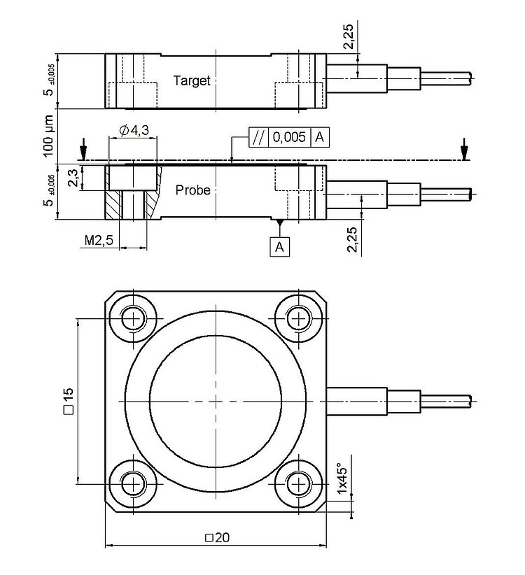 Capacitive two-plate position sensor, 100 µm nominal measuring range, aluminum