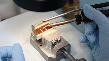PI Ceramic inoltre realizza l' integrazione degli elementi piezo nel prodotto del cliente. Questo include sia il contatto elettrico degli elementi secondo i requisiti del cliente che il montaggio dei componenti forniti dal cliente, così come l'incollaggio o la saldatura della piezoceramica. Per il cliente, questo significa un processo di produzione più veloce e tempi di consegna più brevi.