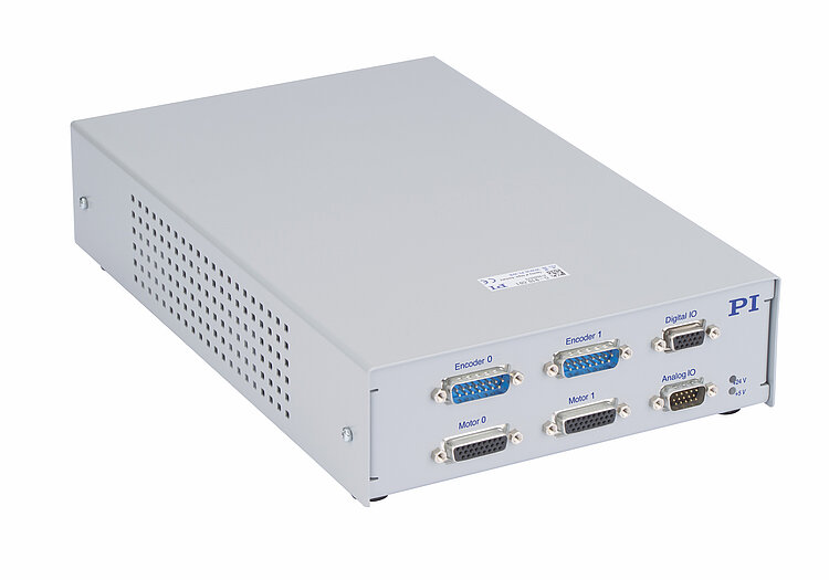 ACS driver module for operation of positioners with different motor and encoder types, can be configured for a variety of applications. 2 axes, 5 A continuous current per axis possible. 2 motor brakes via PWM brake driver, reduced heat generation by the motor brake. Motion profiles are generated by an external motion controller, e.g., G-910.RC02, and received via EtherCAT. The motion controller must be ordered separately.
