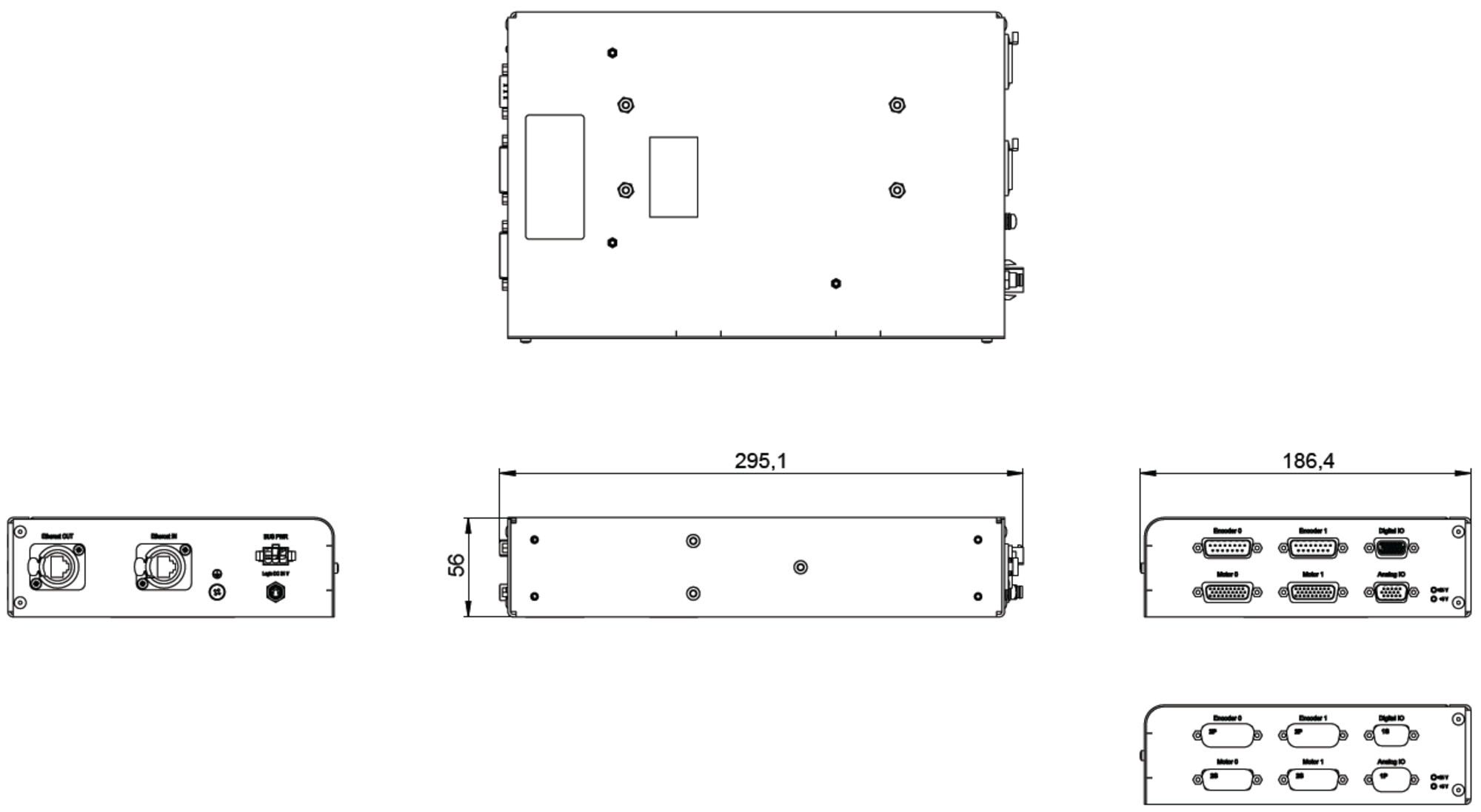 | Digital I/O lines | HD D-sub 15 (f):2 × outputs PNP 24 V source; also control the brake drivers at the motor connectorsDefault for inputs:2 × PNP 24 V source on HD D-sub 15 (f); in addition 2 × NPN 5 V sinking for reference switches on the motor connectorsOptional configuration for inputs:4 × PNP 24 V source on HD D-sub 15 (f) | ||