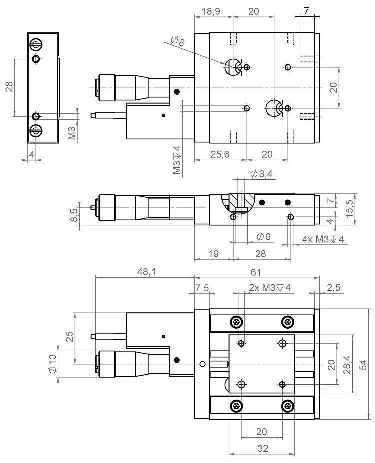 The M-105-linear stages are available in various configurations and allow travel ranges up to 18 mm. They have crossed roller bearings that allow a guiding accuracy of better than 2 µm. The motion platform is preloaded with springs against the precision micrometer screw to suppress backlash.
