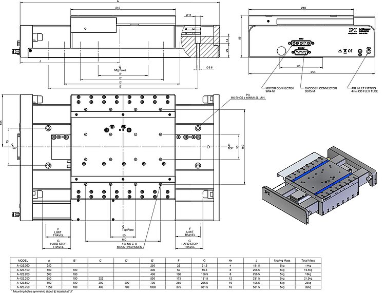 A-123 PIglide AT3 Series Linear Air Bearing Stage, Linear Motor Driven with Encoder Feedback