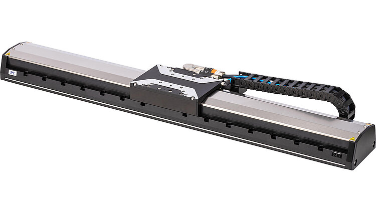 High-load linear stage; ironless 3-phase linear motor; 407 mm travel range; 400 N load capacity; 2000 mm/s maximum velocity; absolute linear encoder, 1 nm sensor resolution, EnDat 2.2; drag chain