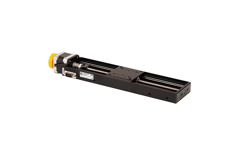 Vacuum-compatible linear stage; 2-phase stepper motor; 200 mm travel range; 50 N load capacity; 10 mm/s maximum velocity; metric leadscrew; vacuum compatible to 10-6 hPa