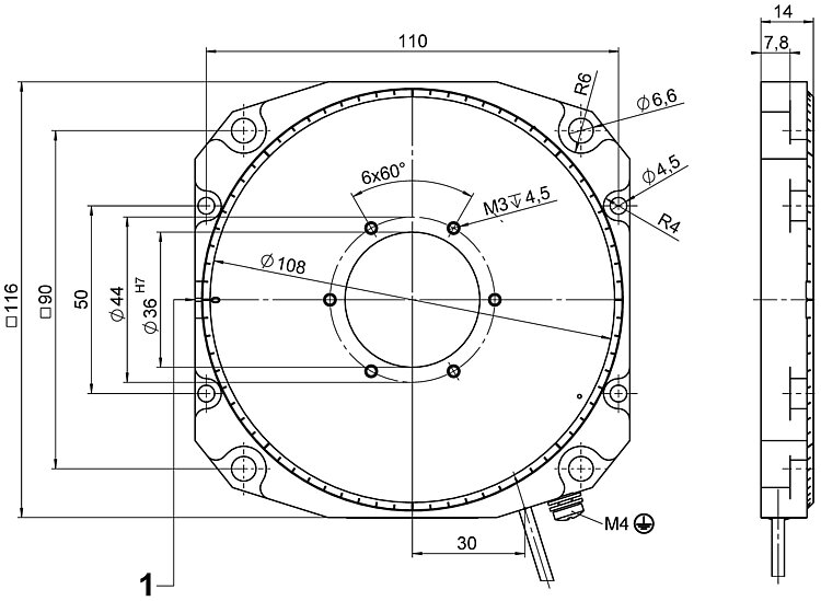 PILine® rotation stage with low-profile design; PILine® piezo motor, performance class 2; >360 ° rotational angle; 20 N load capacity; 540 °/s maximum angular velocity; incremental angle measuring system, 4 µrad sensor resolution; 1.5 m cable length