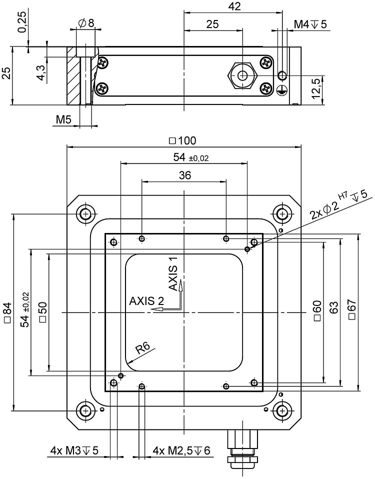 XY piezo nanopositioner; 100 µm × 100 µm travel range (X × Y); capacitive, indirect position measuring; D-sub 25W3 (m); 1.5 m cable length