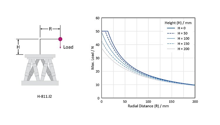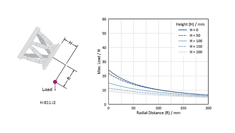 The PIVirtualMove software, which can be downloaded free of charge, simulates the travel range, the alignment, and the permissible forces and torques of the H-811 to facilitate an optimum system configuration. In this context, both the chosen center of rotation and the center of gravity of the load are taken into consideration.