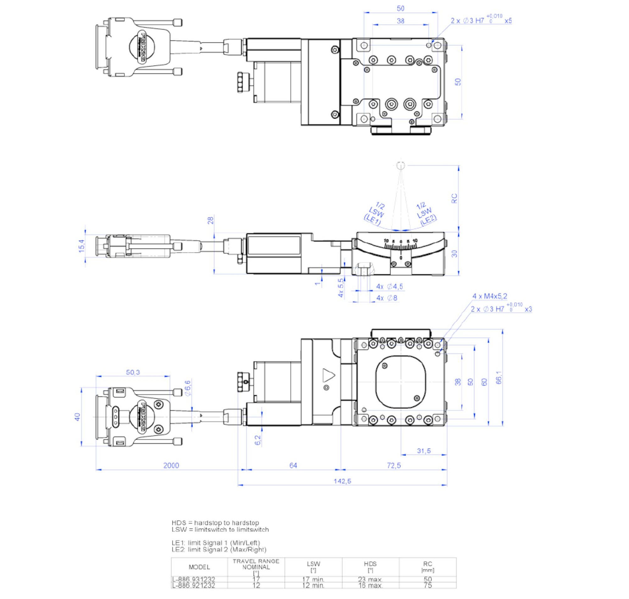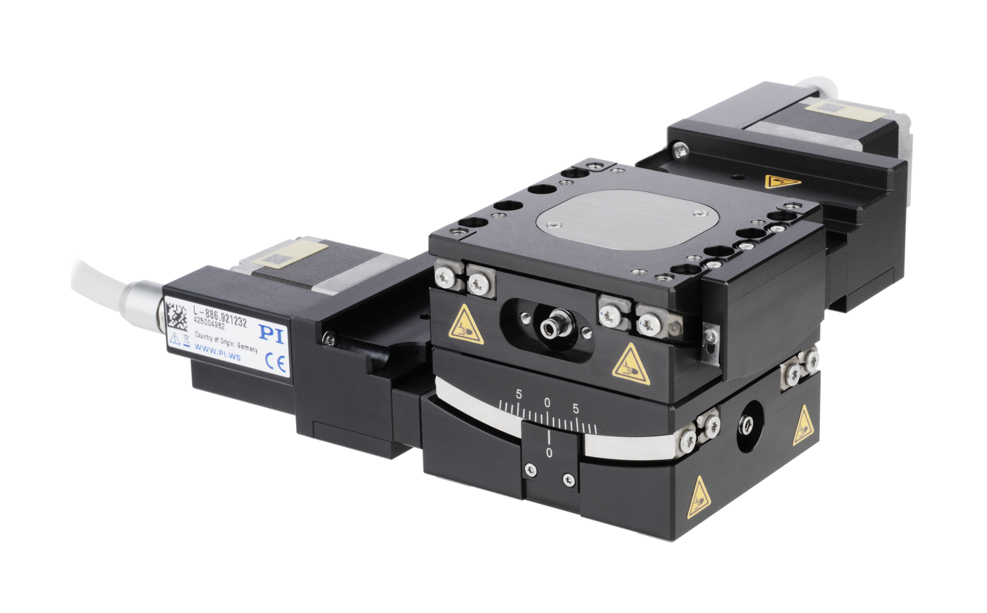 The goniometers can be mounted onto L-836 linear stages. The L-886 models are stackable for 2-axis motion. If an L-886.931232X is mounted onto an L-886.921232[X], the models will have a common center of rotation.